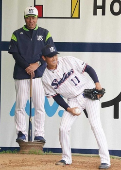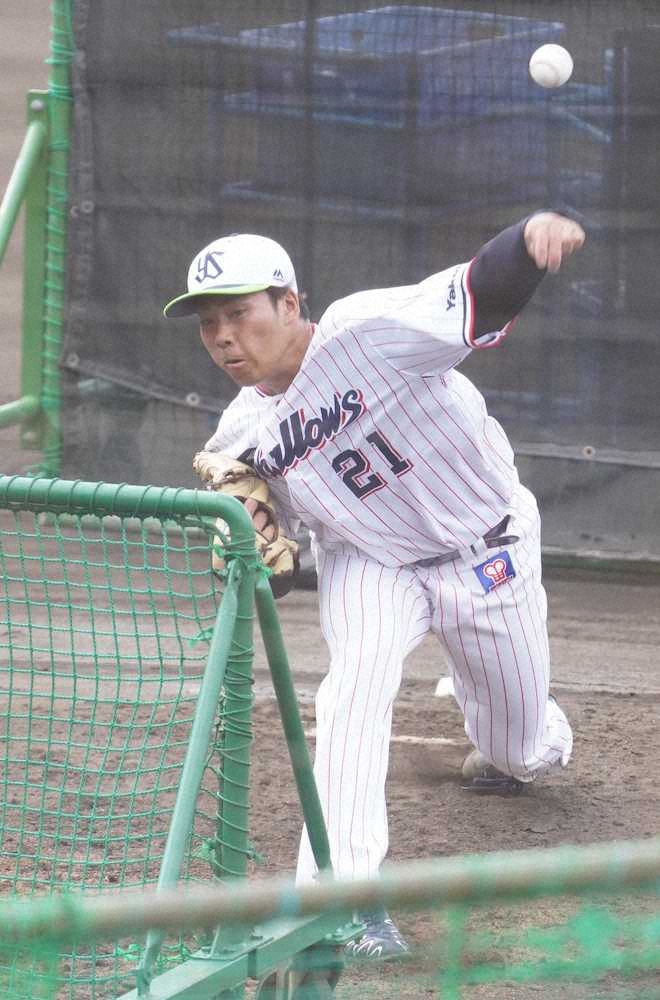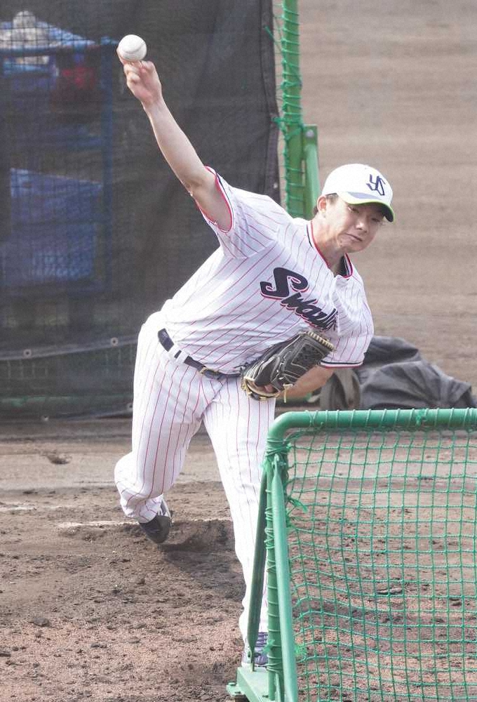 <ヤクルトキャンプ>フリー打撃に登板する山野(撮影・村上 大輔)=15日、沖縄・浦添