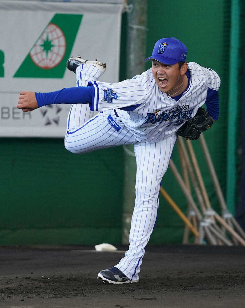 <DeNA2軍キャンプ>ブルペンで投球練習する山崎(撮影・島崎忠彦)=15日、沖縄・宜野湾