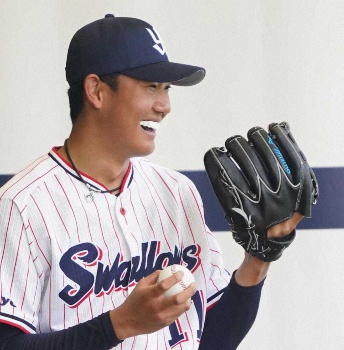 <ヤクルトキャンプ>ブルペンで笑顔の奥川。白い歯ではなくマウスピース(撮影・村上 大輔)=15日、沖縄・浦添