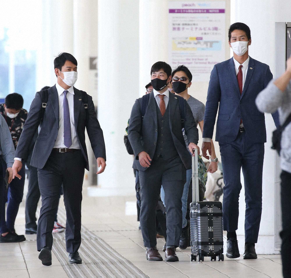 <巨人沖縄キャンプ>沖縄入りした(左から)桜井、大江、秋広(撮影・森沢裕)=15日、沖縄・那覇市