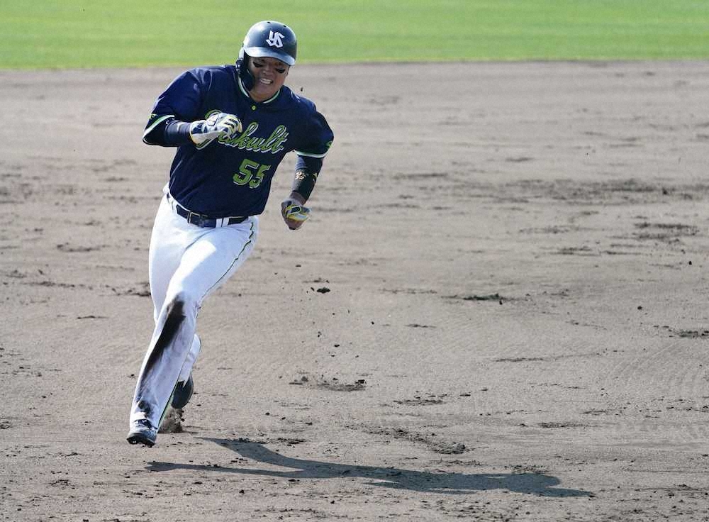<ヤクルト浦添キャンプ>紅白戦、2回の無死二塁から西浦の安打で三塁に進む村上(撮影・長久保 豊)=15日、沖縄・浦添市