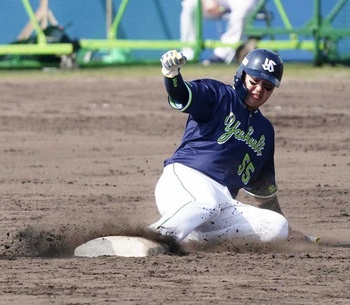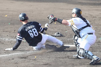 <ヤクルト浦添キャンプ>紅白戦の4回、四球で出塁後、西浦の飛球で二塁へタッチアップする村上(撮影・長久保 豊)=15日、沖縄・浦添市