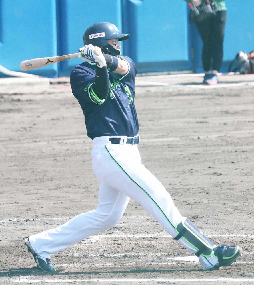 <ヤクルト・浦添キャンプ 紅白戦>2回無死、左前打を放つ村上(撮影・村上 大輔)=15日、沖縄・浦添市