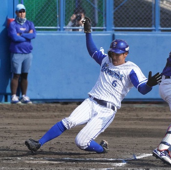 <練習試合DeNA×沖縄電力>6回無死一、二塁、蛯名の右前適時打で生還する森(撮影・島崎忠彦)=15日、沖縄・宜野湾市