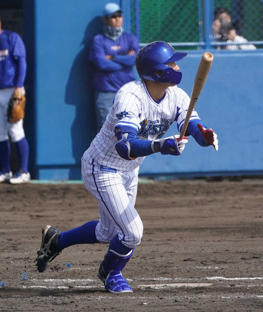 <練習試合DeNA×沖縄電力>6回無死、中越え二塁打を放つ森(撮影・島崎忠彦)=15日、沖縄・宜野湾市