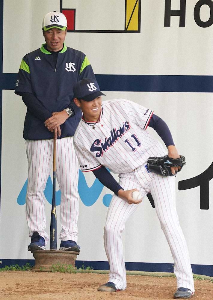 <ヤクルト・浦添キャンプ>ブルペンで高津監督(左)と談笑する奥川(撮影・村上 大輔)=15日、沖縄・浦添市