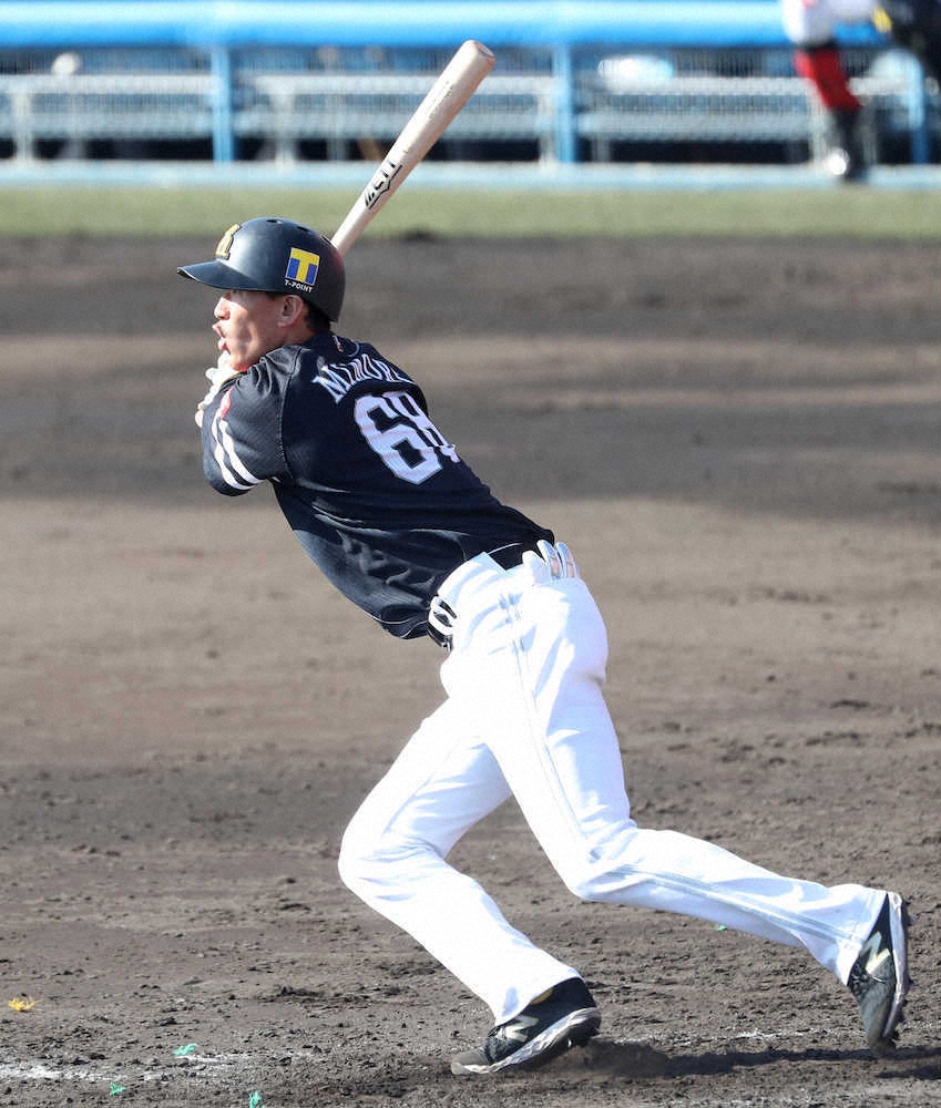 <オリックスキャンプ12日目・紅白戦>5回無死二塁、三塁、杉本裕太郎は右越え3ラン(撮影・井垣 忠夫)=15日、宮崎・清武