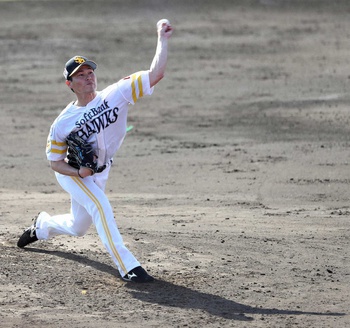 <ソフトバンク春季キャンプ、紅白戦>2イニングを6人で抑えた笠谷(撮影・中村 達也)=15日、宮崎・生目の杜