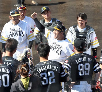<ソフトバンク春季キャンプ、紅白戦>試合前に円陣で声出しをする佐藤(撮影・中村 達也)=15日、宮崎・生目の杜