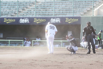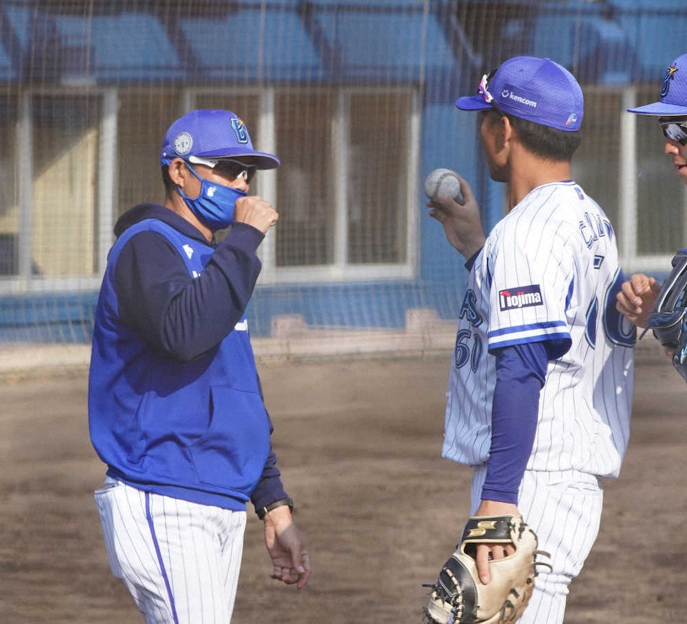訂正<練習試合DeNA×沖縄電力>練習試合に勝利し知野(右)からウイニングボールを受け取らなかった仁志2軍監督(撮影・島崎忠彦)=15日、沖縄・宜野湾市
