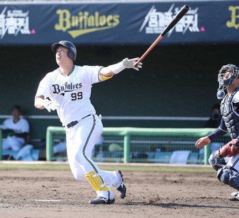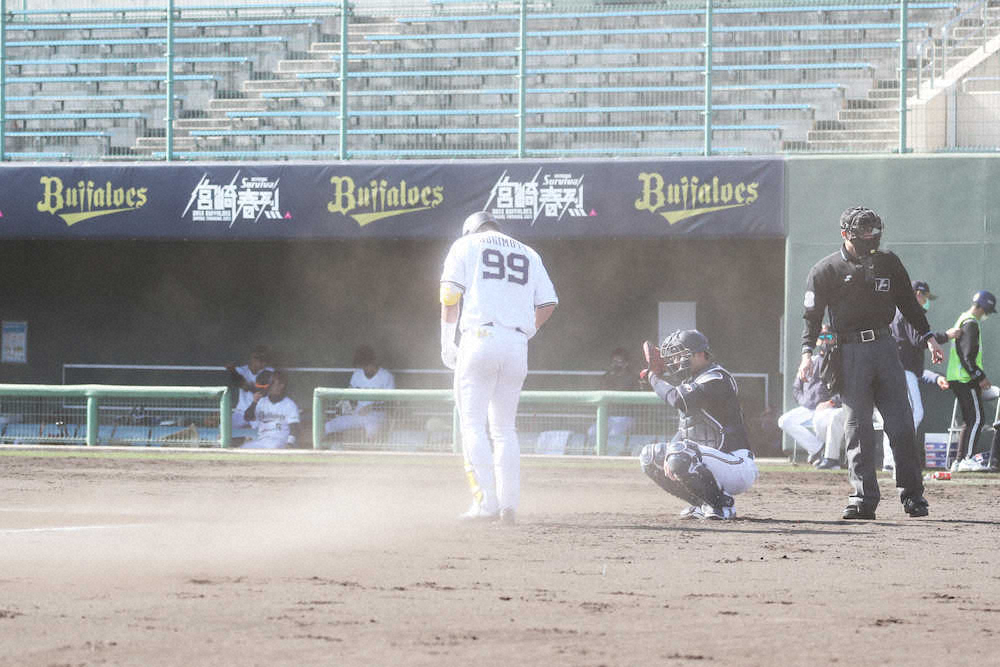 <オリックスキャンプ12日目・紅白戦>5回、打席に入る杉本裕太郎は嵐を呼ぶ予感?(撮影・井垣 忠夫)=15日、宮崎・清武