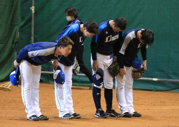 <西武キャンプ>守備練習を終えて、コーチに一礼する(左から)熊代、源田、山田、川野(撮影・尾崎 有希)=15日、宮崎・南郷
