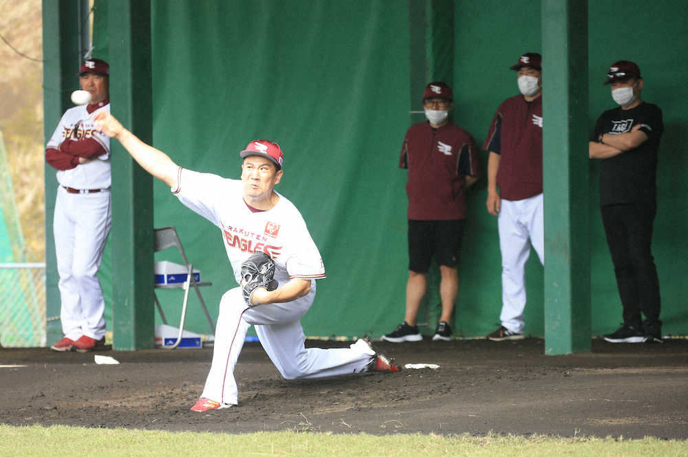石井GM兼監督、三木谷オーナーらに見守られながら投球練習する田中将(撮影・白鳥 佳樹)