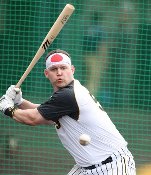 日の丸バンダナを巻いてバットを振る阪神・サンズ(撮影・坂田 高浩)