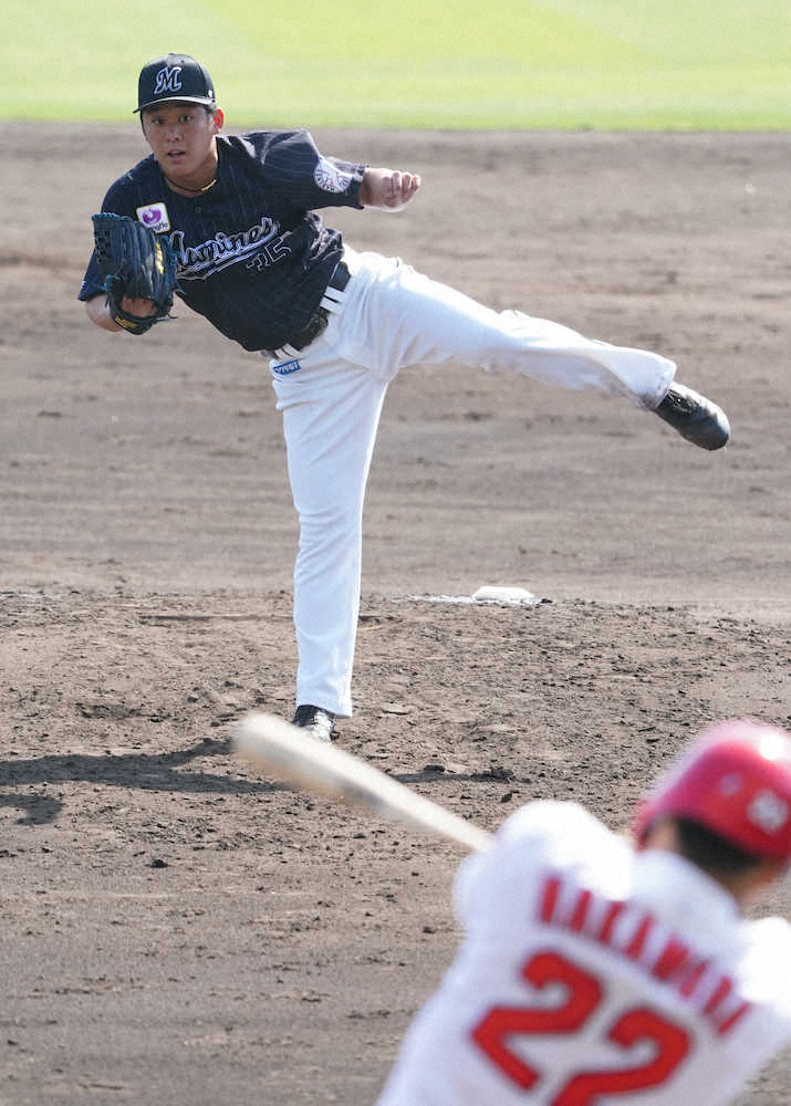 ロッテのドラフト1位・鈴木昭汰投手(法大)が16日、コザしんきんスタジアムで行われた広島との練習試合で実戦デビューを果たした。