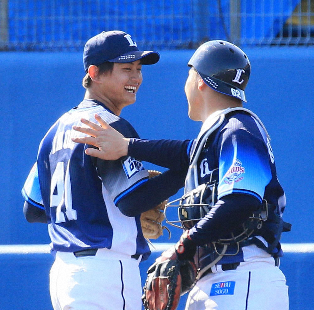 <西武・南郷キャンプ>紅白戦の3番手で好投し、駒月(右)からねぎらわれ笑顔を見せる井上(撮影・尾崎 有希)