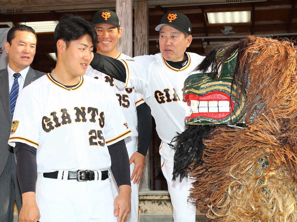獅子舞に頭をかまれる岡本(手前)。奥は(右から)原監督、桜井、大塚副代表 (撮影・光山 貴大) Photo by スポニチ 巨人・岡本和 恒例“かまれ役”継承 前任者・原監督から直々に「バトンタ… ギャラリーで見る この記事のフォト 2021年02月17日の画像一覧 もっと見る 2021年02月17日の画像をもっと見る
