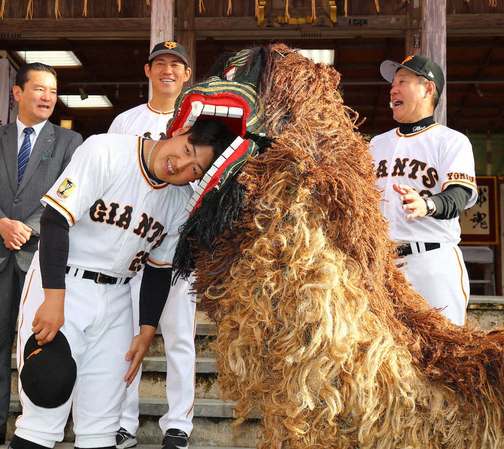 原監督から「バトンタッチだ」と託された岡本和が、恒例の獅子舞に頭をガブリとかまれるポーズを披露。大役を継承する形で、指揮官らから拍手を送られた。