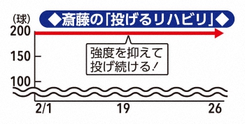これまでにないプログラムの保存療法で治療を進める。強度を抑えて球数を投げることも治療の一環で、キャンプでは休日以外は連日約200球を投げている。このまま続ければ今キャンプで4000球を超えるが、斎藤は「キャッチボールから始まって強度も軽いので」と説明。球数は目的ではなく、投げることでリハビリができることに重点を置いており「(このプログラムが)新しい概念になっていくんじゃないかと思う」と話した。(秋村 誠人)