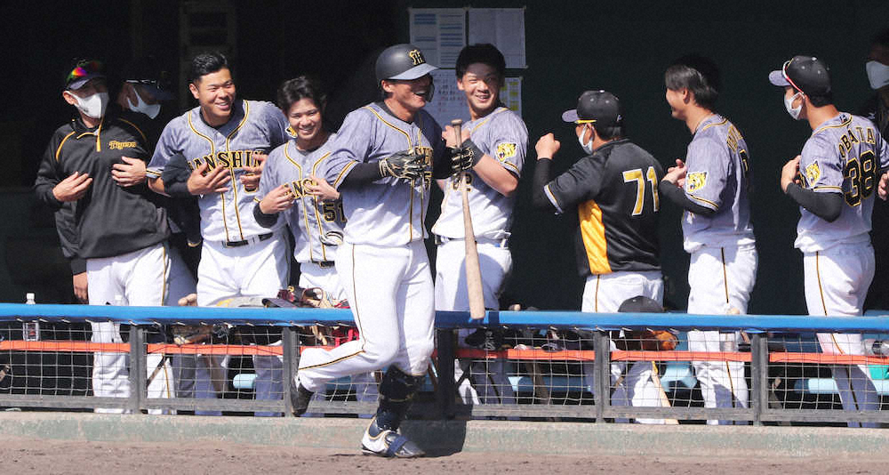 <練習試合 中・神>6回1死、左越えソロホームランを放った陽川(手前)を、ゴリラポーズで迎える佐藤輝(左から2人目)ら阪神ナイン(撮影・椎名 航)