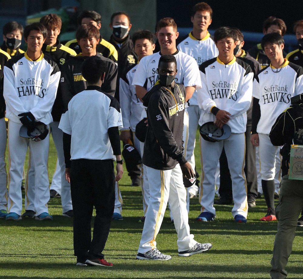 <ソフトバンクキャンプ>キャンプに合流しナインを前にあいさつするモイネロ(中)(撮影・岡田 丈靖)=23日、宮崎・生目の杜