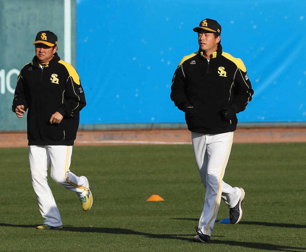 <ソフトバンクキャンプ>A組に昇格しアップする大関(左は津森)(撮影・岡田 丈靖)=23日、宮崎・生目の杜