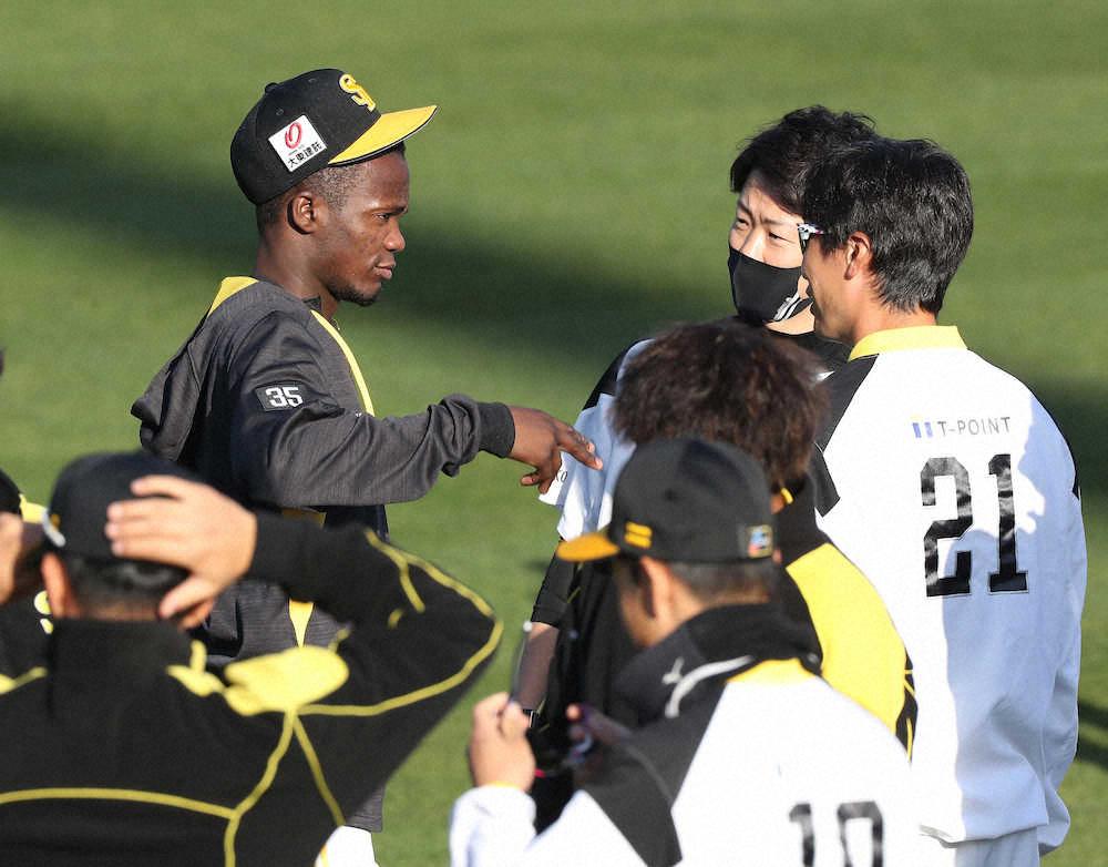 <ソフトバンクキャンプ>キャンプに合流し和田(右)と話すモイネロ(撮影・岡田 丈靖)=23日、宮崎・生目の杜