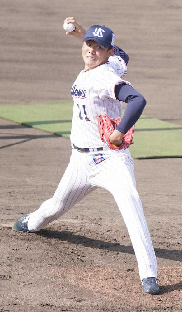 <練習試合 神・D>力投する秋山(撮影・椎名 航)=23日、沖縄・宜野座