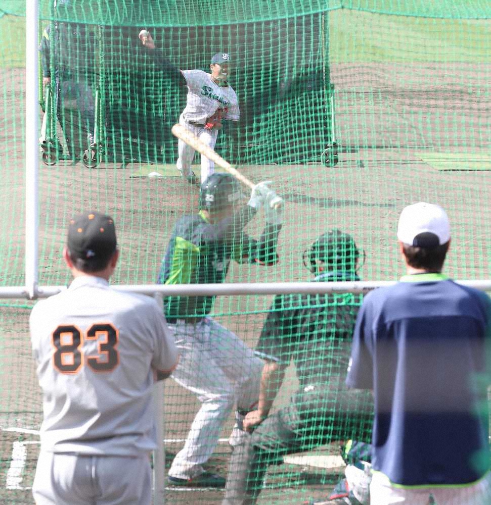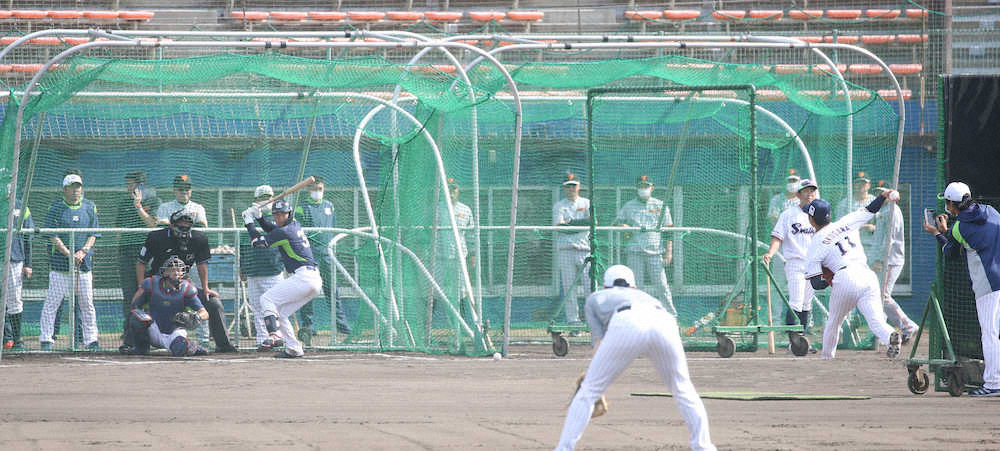 <ヤクルトキャンプ>(手前左から)原監督、高津監督が見つめる中、フリー打撃登板する奥川(撮影・村上 大輔)=23日、沖縄・浦添