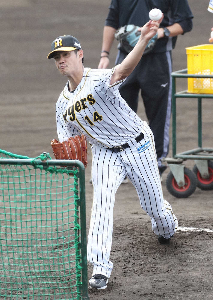 <阪神キャンプ>フリー打撃に登板し、力投するチェン(撮影・椎名 航)=23日、沖縄・宜野座