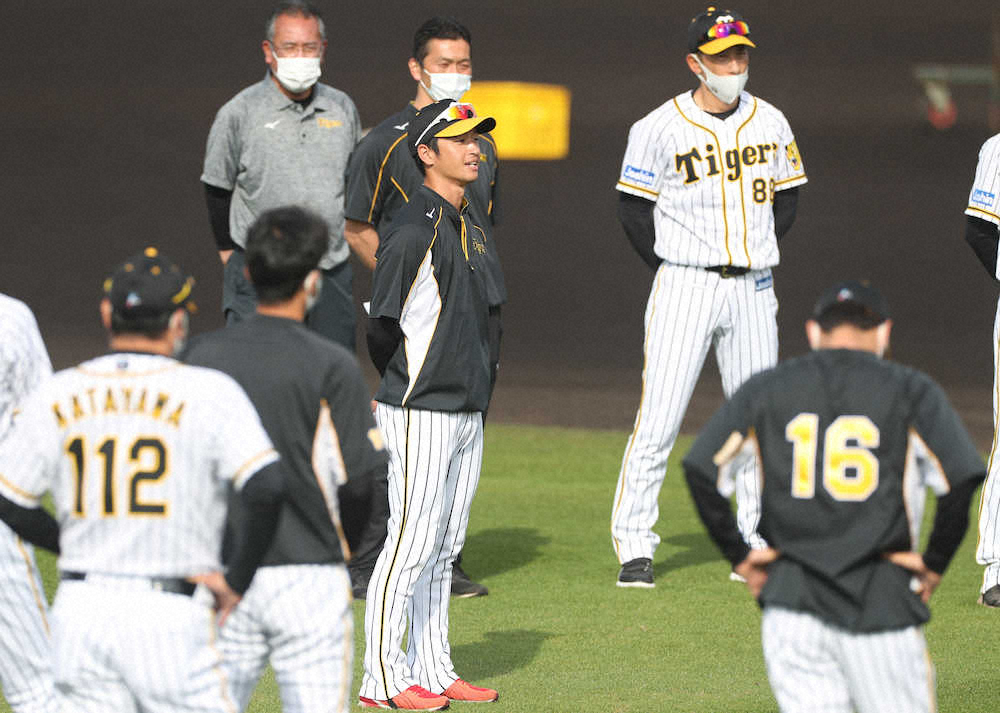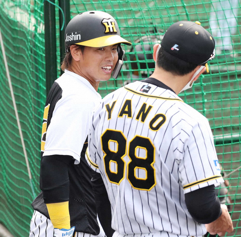 <阪神キャンプ>前日別メニュー調整した梅野は全体練習に加わり矢野監督(右)と話す(撮影・椎名 航)=23日、沖縄・宜野座