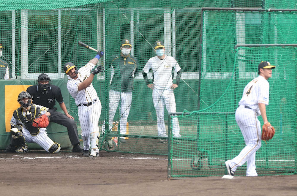 <阪神キャンプ> 打撃練習で登板したチェン(右)と対戦するマルテ (撮影・平嶋 理子) =23日、沖縄・宜野座