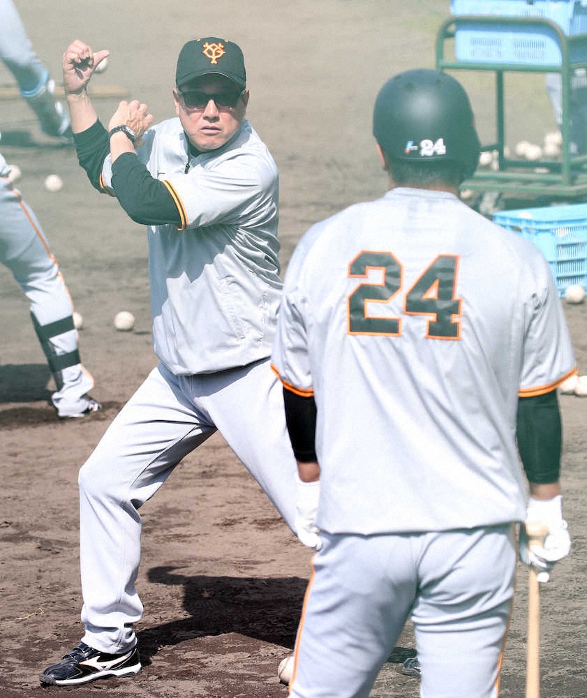 <巨人キャンプ>丸(左)らに対してバッティング投手を行った桑田チーフコーチ補佐 (撮影・森沢裕)=23日、那覇市