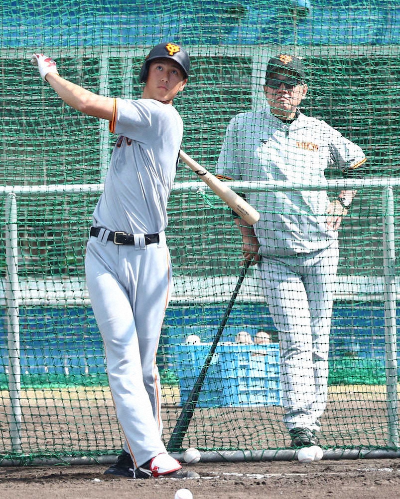 <練習試合 ヤ・巨> 原監督(右)が見つめる中、打撃練習をする秋広 (撮影・光山 貴大)=23日、沖縄・浦添
