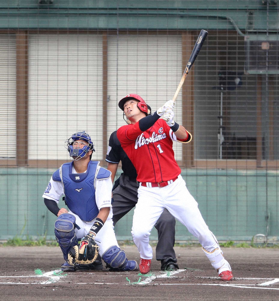 <練習試合 中・広> 1回2死、鈴木誠は右越えソロを放つ(撮影・大森 寛明)=23日、沖縄・北谷