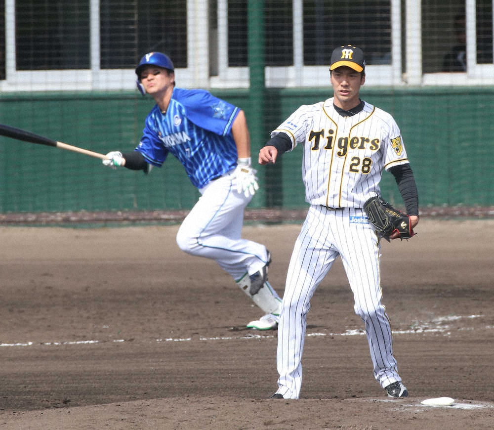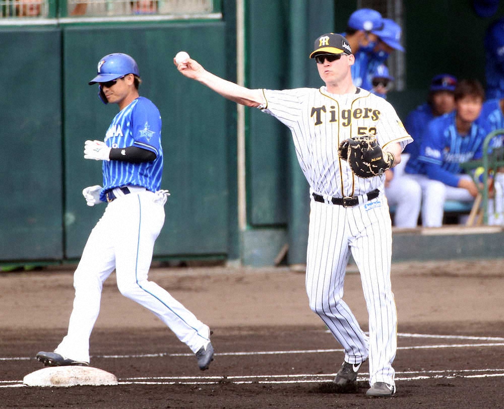 <練習試合 神・D>初回無死、神里(左)の一ゴロをさばくサンズ(撮影・北條 貴史)=23日、沖縄・宜野座