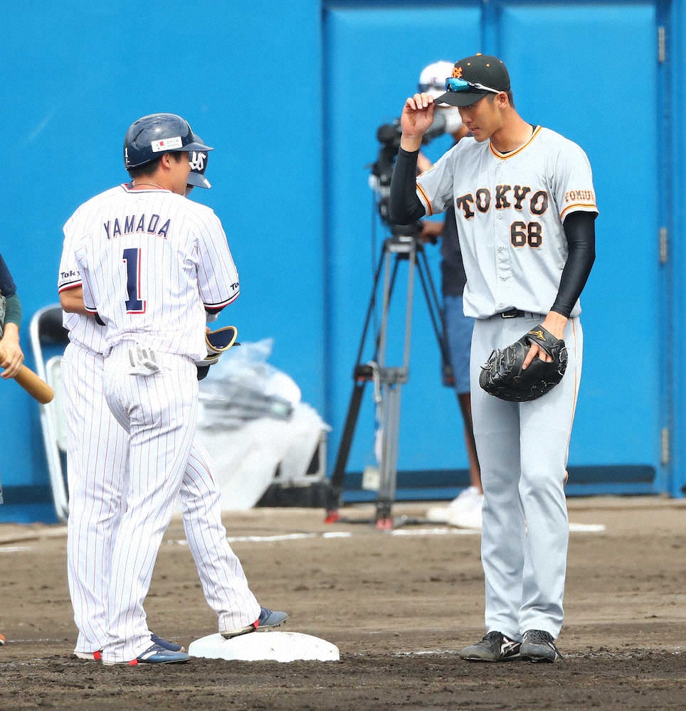 <練習試合 ヤ・巨> 初回2死、左前打を放った山田(左)にあいさつをする秋広 (撮影・光山 貴大)=23日、沖縄・浦添