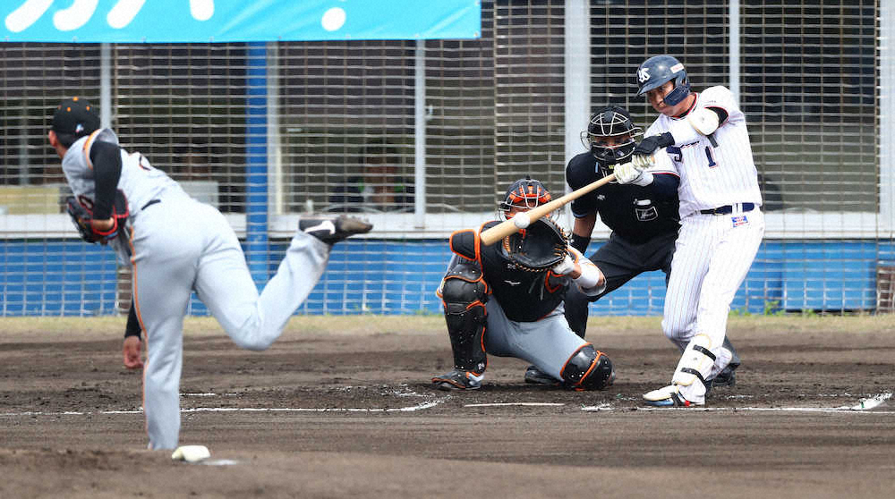<練習試合 ヤ・巨> 初回2死、左前打を放つ山田。投手・平内 (撮影・光山 貴大)=23日、沖縄・浦添