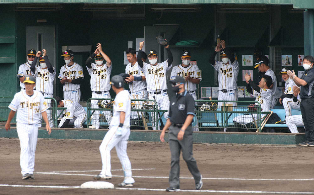 <練習試合 神・D>2回無死一塁、木浪の先制適時三塁打に盛り上がる阪神ベンチ(撮影・北條 貴史)=23日、沖縄・宜野座