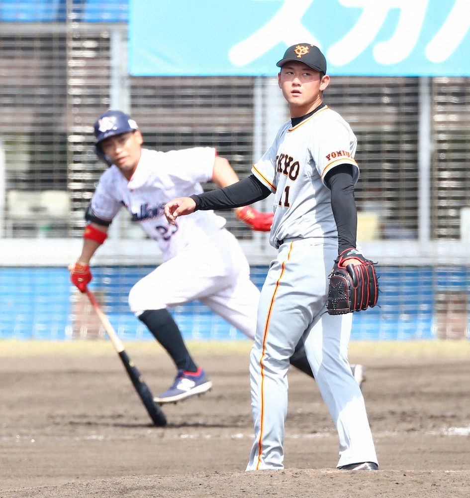 <練習試合 ヤ・巨> 2回2死一塁、青木(左)に適時二塁打を浴びる平内 (撮影・光山 貴大)=23日、沖縄・浦添