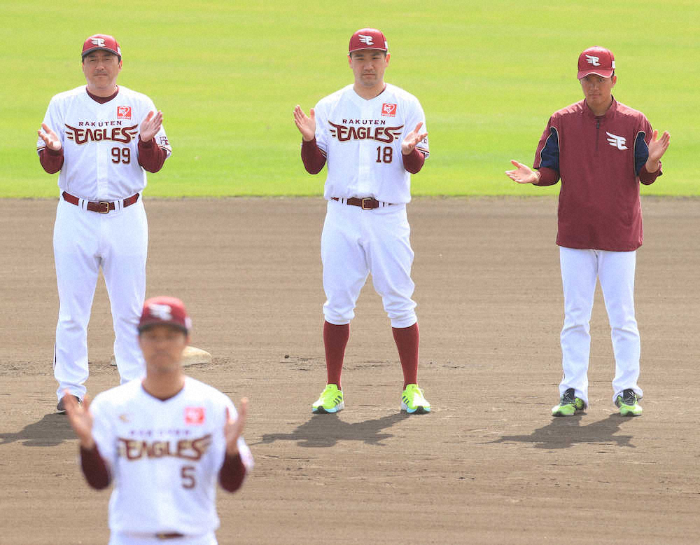 <楽天キャンプ>茂木(手前)の音頭で手締めする楽天(左から)石井GM兼監督、田中将、早川(撮影・白鳥 佳樹)