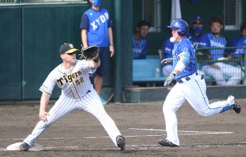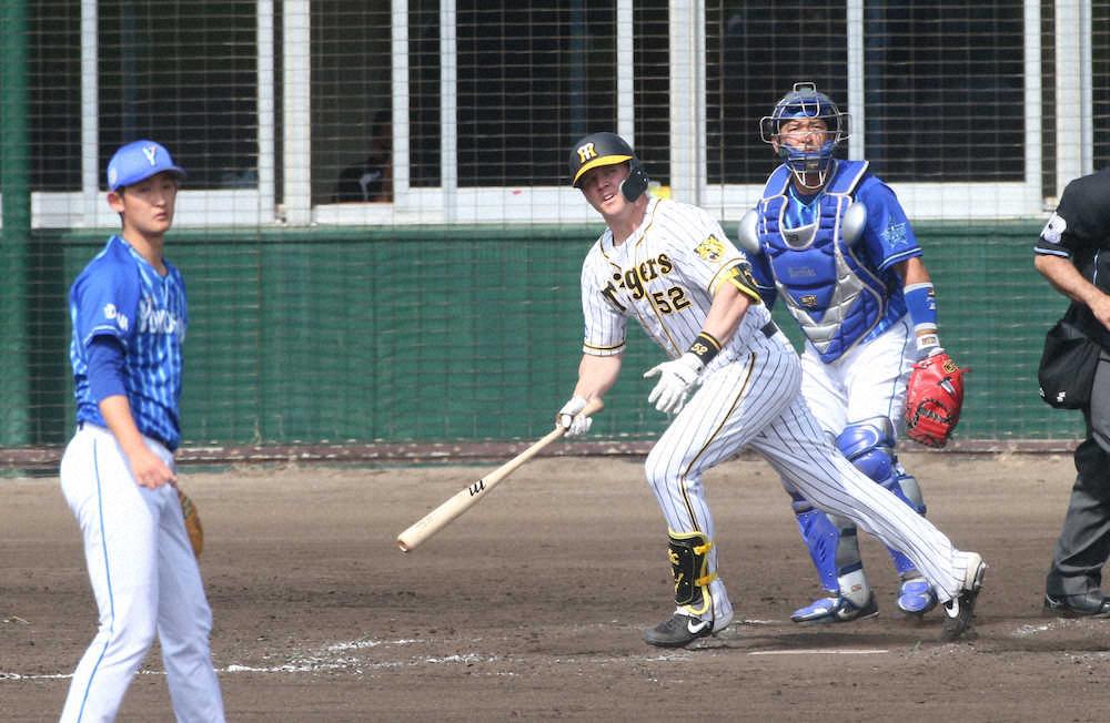 <練習試合 神・D>4回無死、サンズは左中間二塁打を放つ。投手阪口(撮影・北條 貴史)