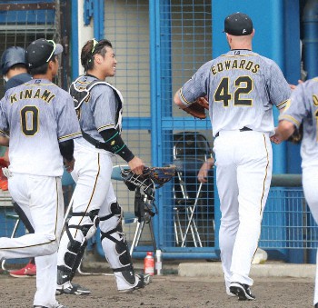 秒速のせめぎ合いは突然やってきた。5回1死からエドワーズが左前打を許した塩見の代走で登場したのはドラフト5位・並木(独協大)。大学時代に通算24盗塁を記録し、成功率100%を誇った。2死まで奪って宮本への2球目。力試しとばかりにスタートを切った無傷の韋駄天(いだてん)を素早い送球動作から“一矢”。助っ人右腕の巧みなクイックモーションも生かし、「失敗しない男」を制圧した。