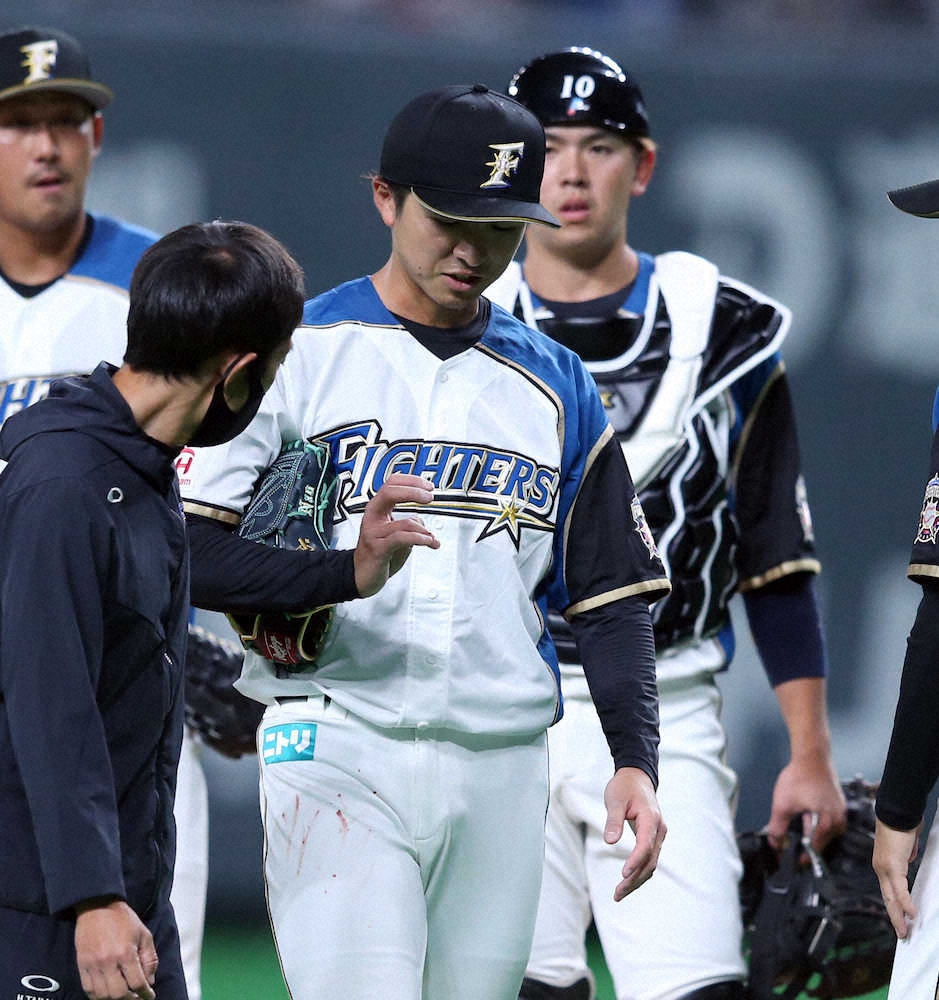 3回2死一塁で、打者・源田の初球143キロが、源田の足元へ引っかかったような投球となった。ここで指を気にする仕草を見せ、ユニホームの右足付け根付近に血がついた状態でベンチへ引きあげた。栗山監督も心配そうな表情を見せていたが、ベンチ内で治療を受けて再びマウンドへ。その後、源田を空振り三振に仕留めた。