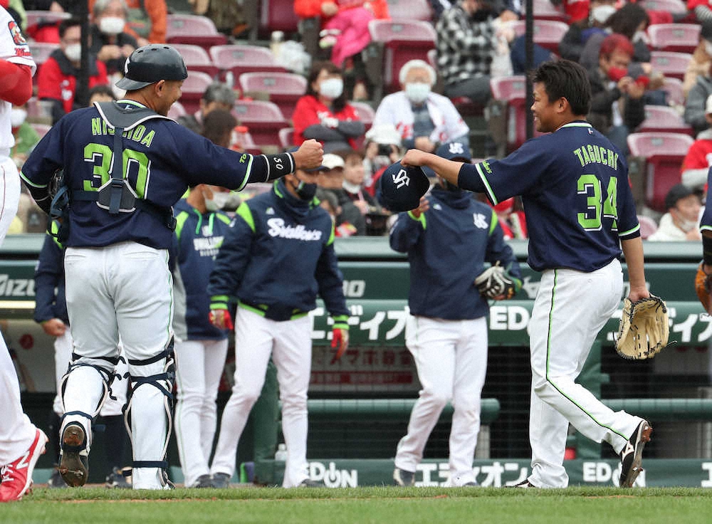 故郷・広島で上々の再出発だ。巨人からトレードで加入したヤクルト・田口が、移籍後初先発。プレートの三塁側と一塁側を踏み分ける投球を新たに取り入れ、2回1安打無失点と好投した。