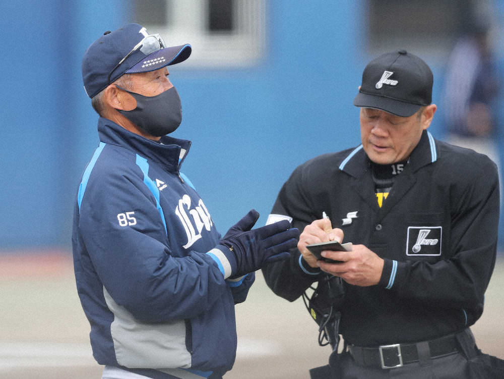 <中日・西武OP戦>交代を告げる辻監督(左)(撮影・椎名 航)