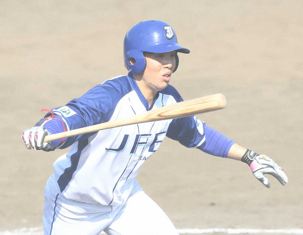 <JFE・東京ガス>3回2死二塁、先制の適時内野安打を放つJFE・内藤 (撮影・光山 貴大)