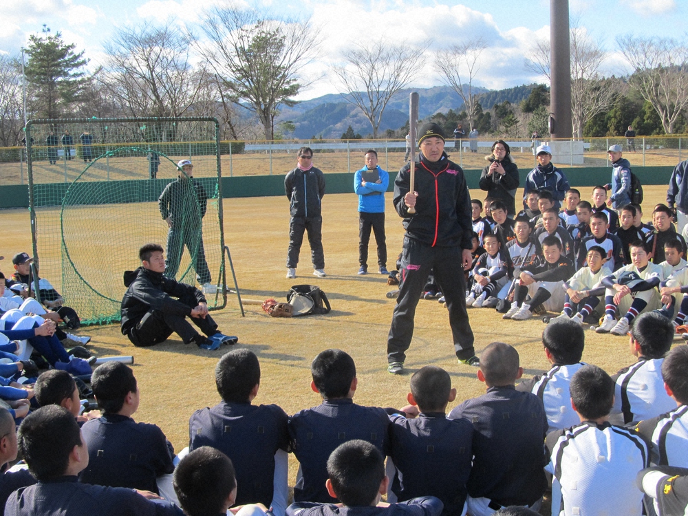 東日本大震災復興支援の目的で開催された野球教室。参加選手は2軍の若手中心だったが、プロ野球のユニホーム姿に圧倒されていた被災地の子どもたちが、杉谷の明るさに心を溶かしていく姿はほほえましかった。