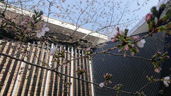 心が浮き立つ。もう、甲子園球場前の桜は咲き始めている。「山笑う」季節、背後に見える六甲の山脈(やまなみ)が笑顔で迎えてくれる。