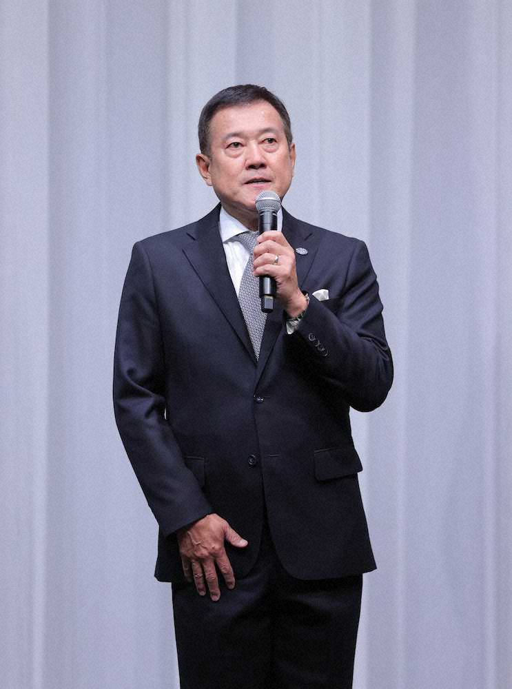 出陣式であいさつをする原監督
